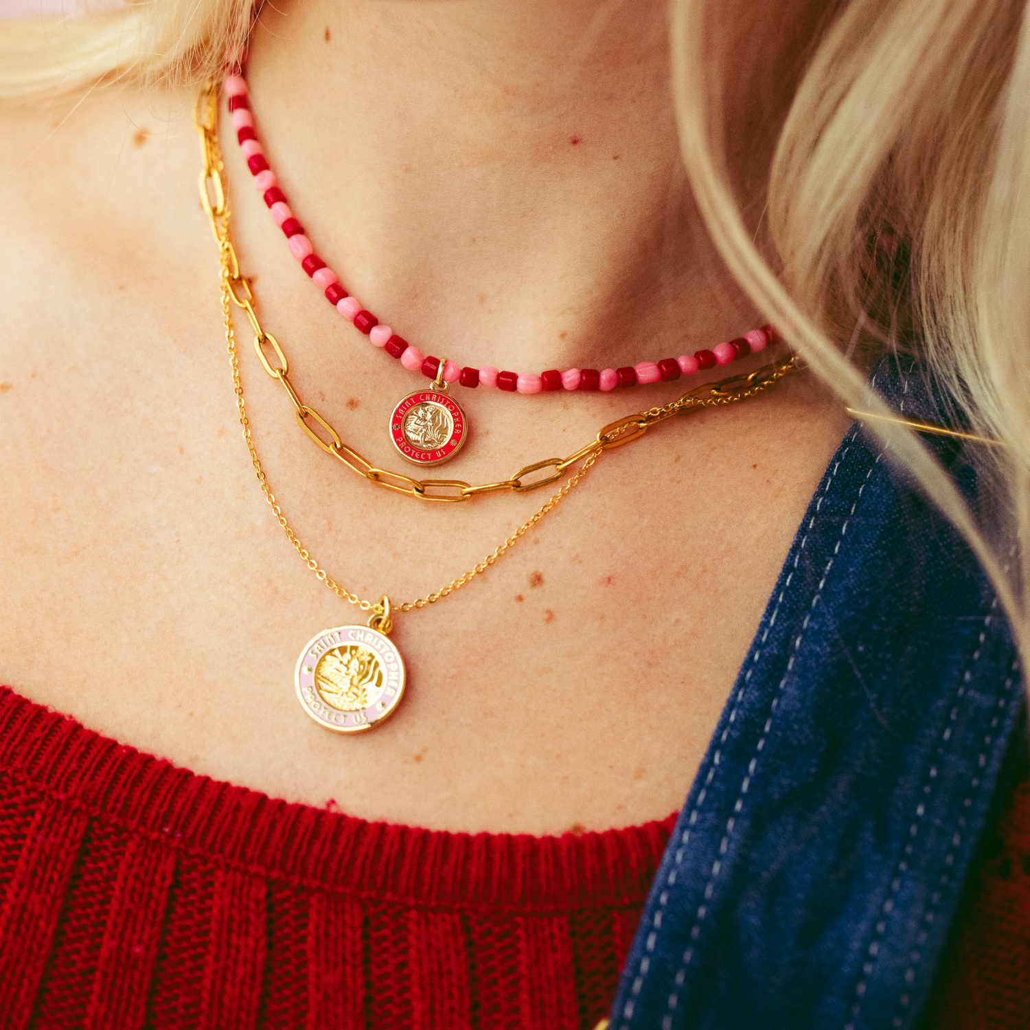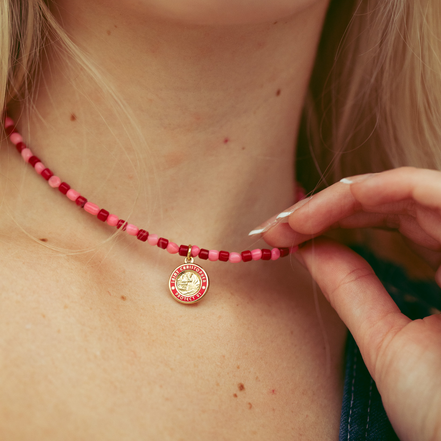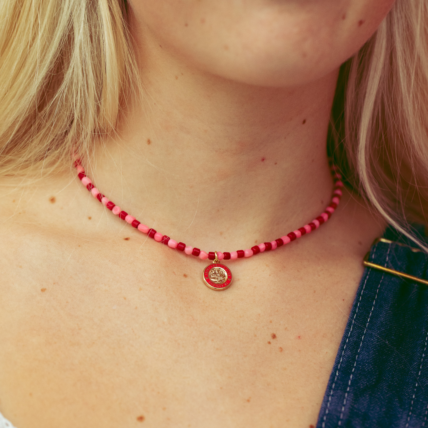 Celebra l'amore e l'avventura con il girocollo con perline Hearts on Fire, l'accessorio perfetto per San Valentino e non solo. Caratterizzato da vivaci perline rosse e rosa abbinate a uno splendido ciondolo dorato raffigurante San Cristoforo, questo girocollo fonde lo spirito dell'amore con l'atmosfera rilassata della spiaggia. Progettato per catturare l'essenza della protezione e del viaggio, è ideale per chi ama lo stile costiero e i gioielli senza tempo di San Cristoforo. Perfetto come regalo o per concedersi un po' d'amore ispirato al mare!