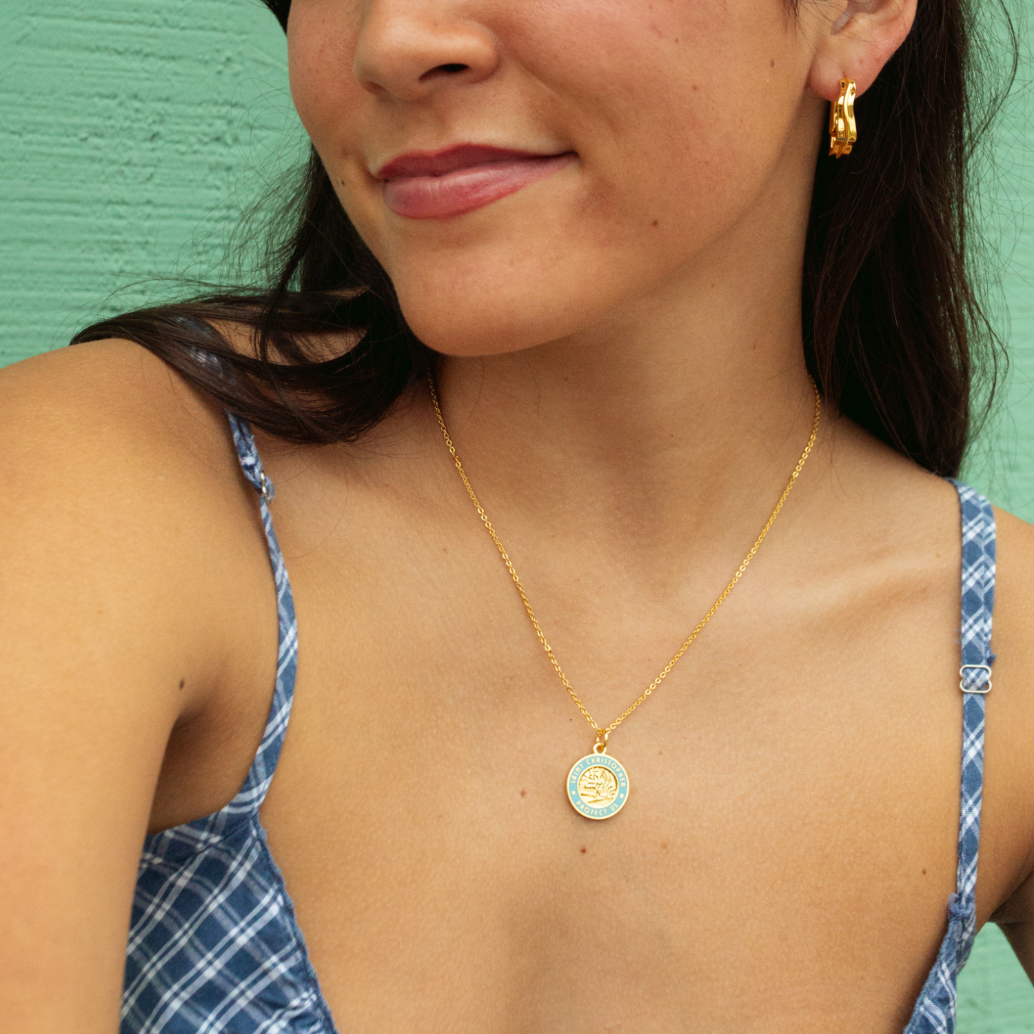 Avete chiesto, vi abbiamo ascoltato! Vi presentiamo la nostra nuova collana di San Cristoforo in oro azzurro. Realizzata con uno splendido bordo in smalto azzurro, questa collana è l'ultima aggiunta alla nostra collezione classica. Ora disponibili in ancora più colori, le nostre collane di San Cristoforo in oro sono perfette per ogni occasione. Disponibili in quantità limitate, quindi affrettatevi!