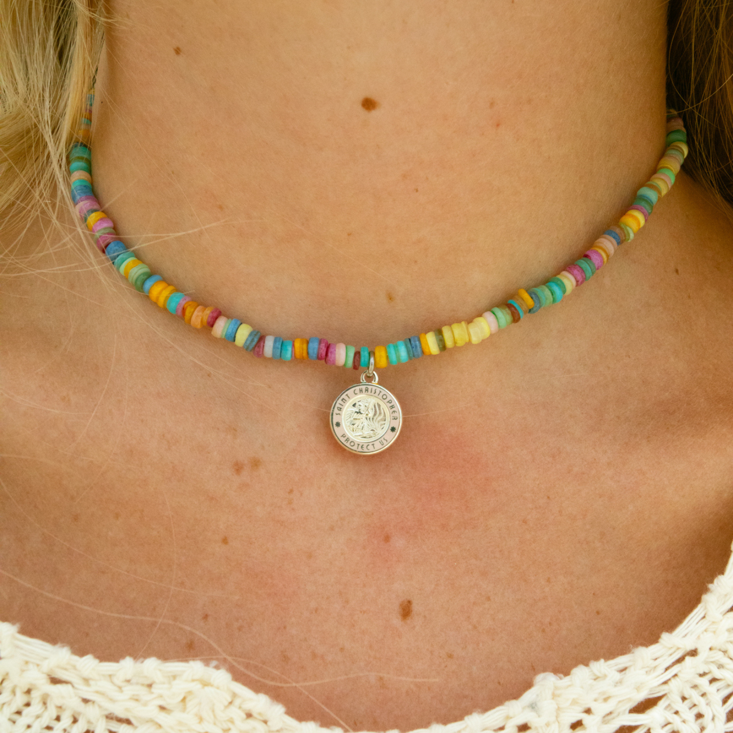 Preparatevi a catturare tutte le vibrazioni sognanti con il nostro girocollo di perline "Tramonti Pastello"! Questo incantevole girocollo presenta un delizioso mix di perline heishi rondelle multicolore pastello, che catturano perfettamente le delicate tonalità del cielo al tramonto. La delicata combinazione di colori aggiunge un tocco stravagante a qualsiasi outfit, rendendolo un accessorio dolce ed elegante per ogni occasione.