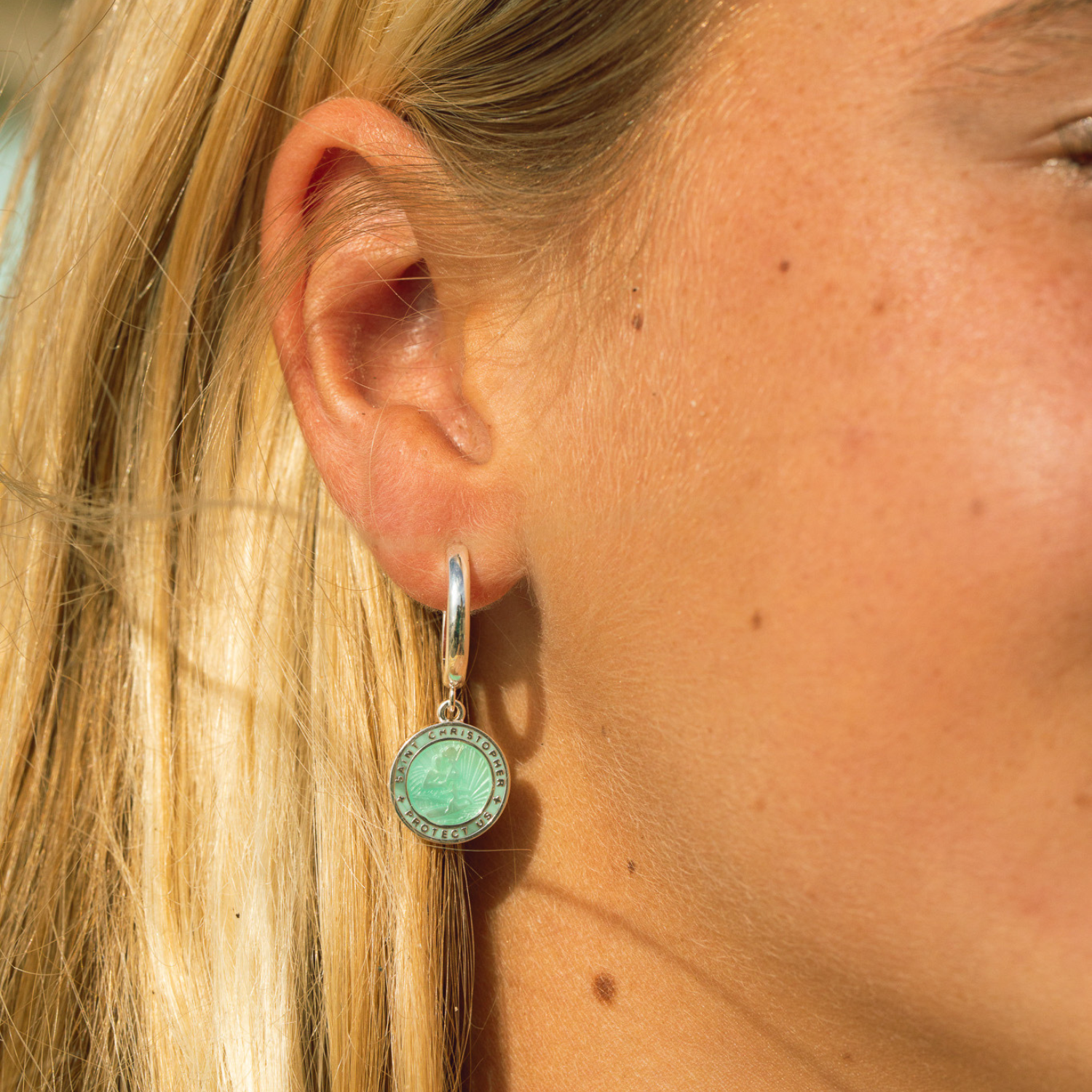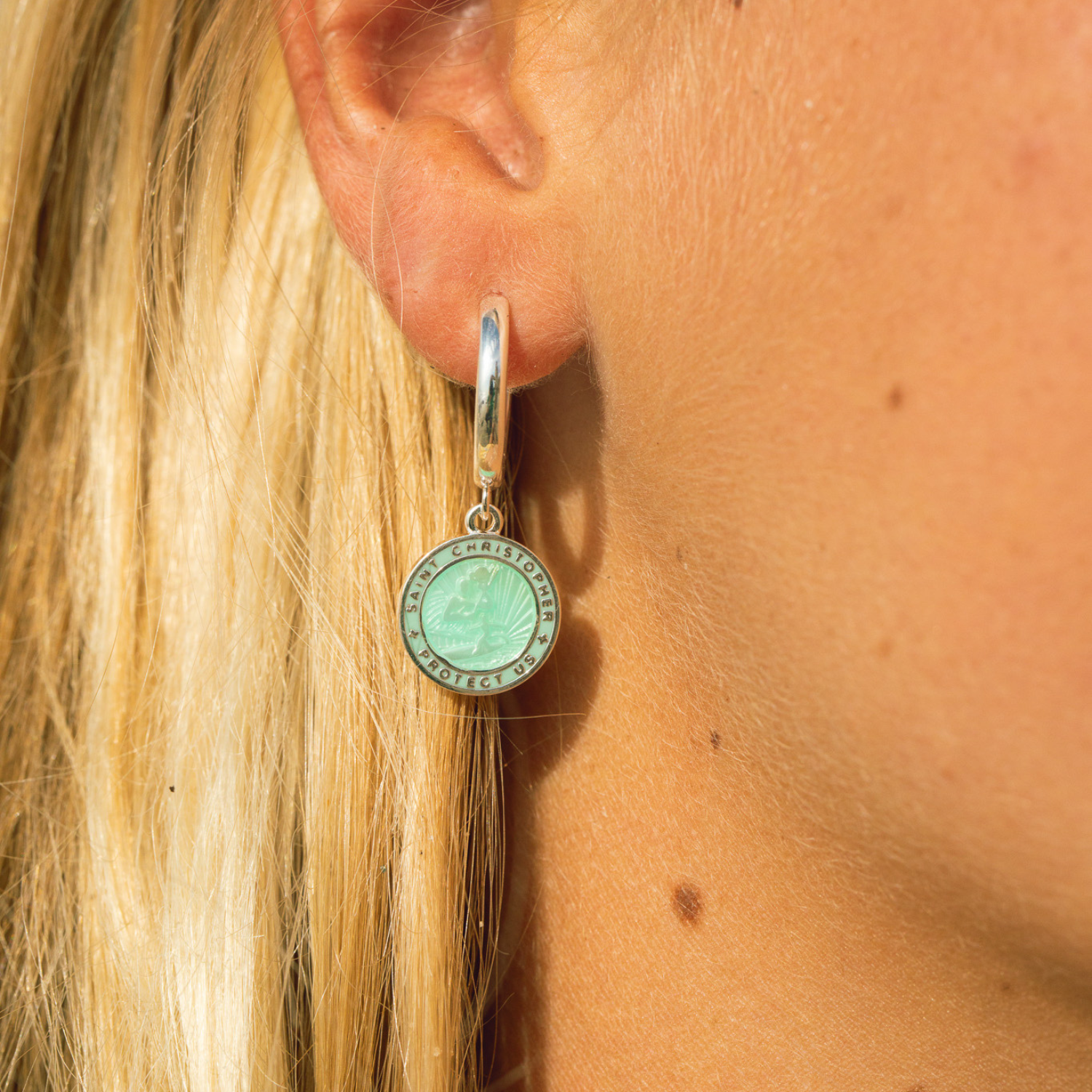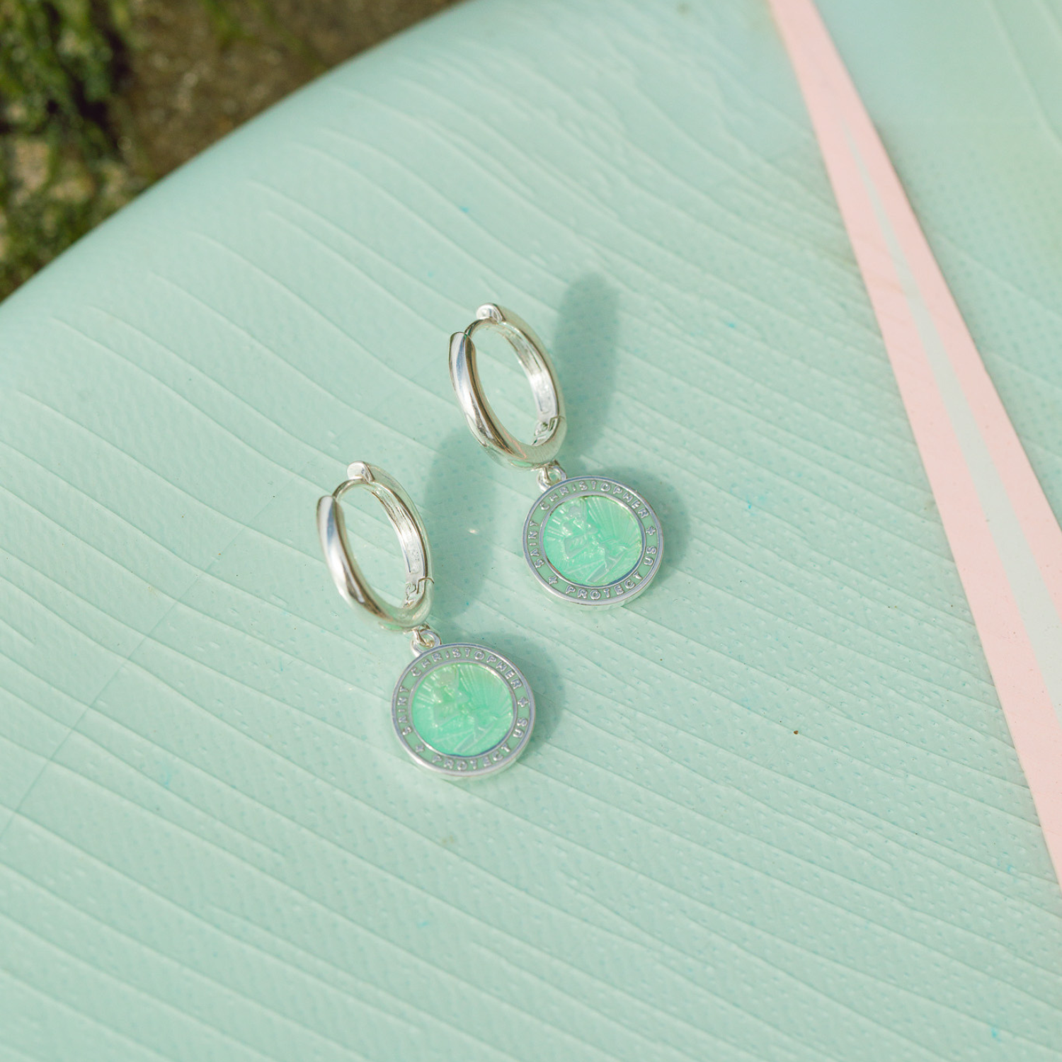 Proteggiti con stile con i nostri orecchini San Cristoforo in uno splendido verde schiuma di mare! Leggeri e vivaci, sono il perfetto mix di fascino ed eleganza ispirata alla costa per qualsiasi outfit.